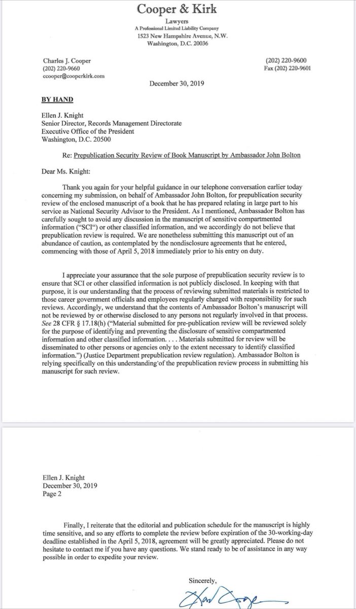 This letter also raises the issue of whether the leak of Bolton’s manuscript constitutes a leak of classified information.pic.twitter.com/DgdRTgc1kh