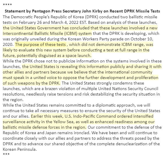 Pentagon just now on N.Korean ballistic missile tests: "US is revealing this information publicly & sharing with allies/partners because we believe that the international community must speak in a united voice to oppose further development & proliferation of such weapons"pic.twitter.com/AY6UOiOrGv