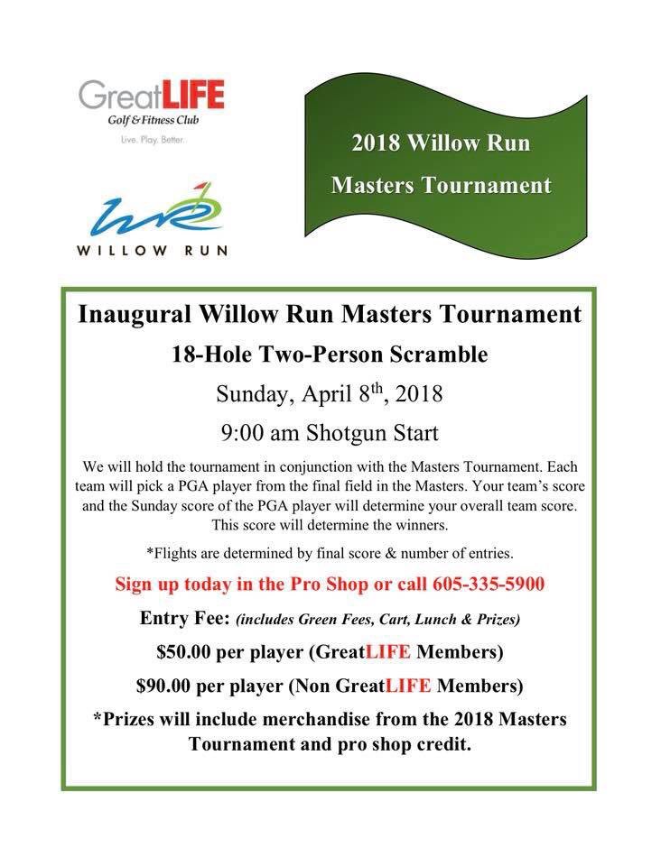 Our Willow Run Masters Tournament is coming up April 8th! Spots are filling up VERY quickly, so don't wait around to sign up! Tag your golfing buddies in the comments below!