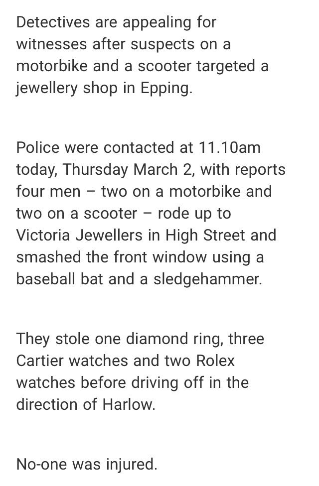 Detectives want to talk to witnesses after Epping High St jewellery raid. Call Loughton CID 101 or Crimestoppers anonymously 0800 555 111pic.twitter.com/bAjqEVVvEq