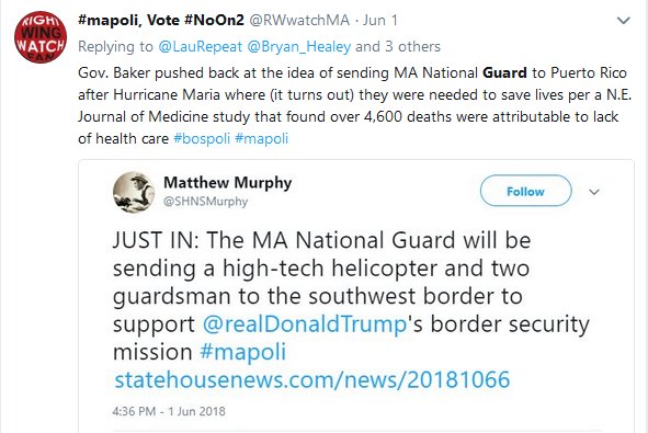Baker announced he'd send MA National Guard to the border June 1. Today is June 18. Charlie Baker is not a leader, he is a follower. A lot of us want to know why he didn't send MA National Guard to Puerto Rico when response & medical care would've saved 1000s of lives