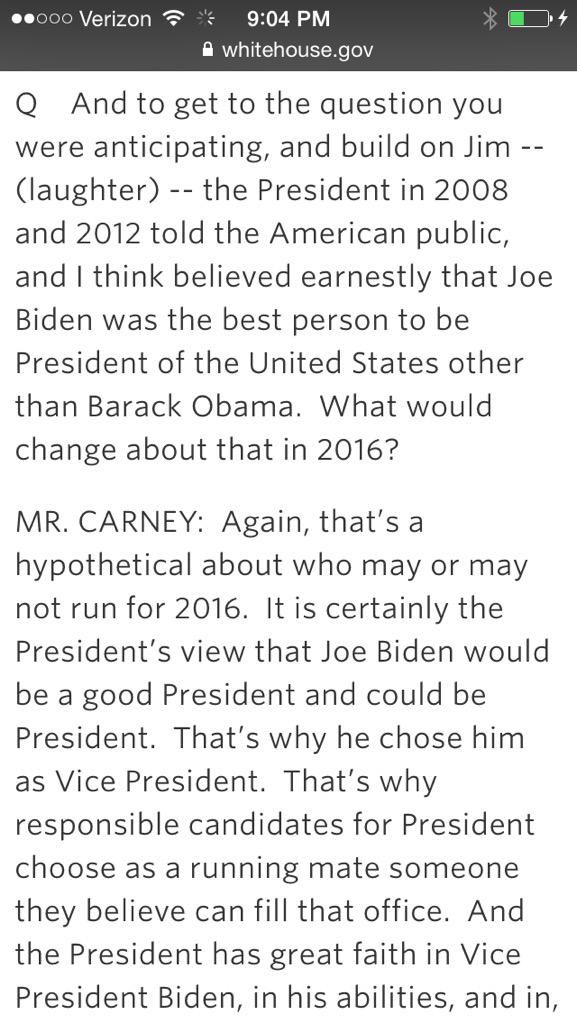 I asked @JayCarney on 2/27/14 whether @POTUS would back an @VP Biden candidacy. Here's the exchange.pic.twitter.com/Ty8sAwC70v