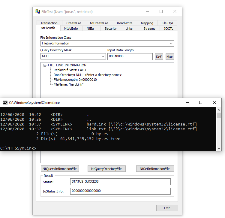 Even without permission to create NTFS symbolic links it is possible to open the reparse point holding file with FILE_OPEN_REPARSE_POINT and create hard links to it. The created hard links will also be NTFS symbolic links.pic.twitter.com/bL21pXqhLI