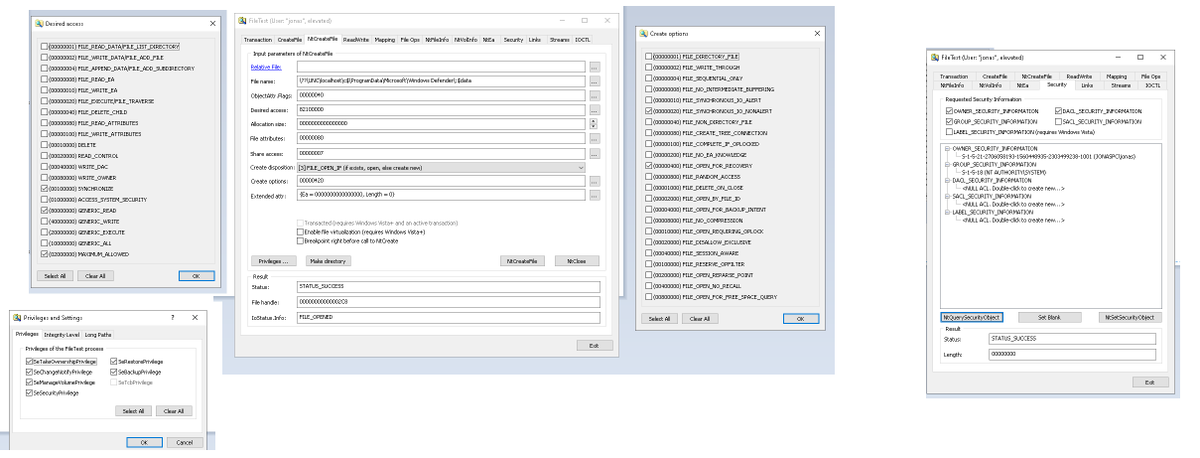 i am not in Microsoft- but I can help ;) Defenders minifilter now protects the owner and ACL on defenders folder- making it harder to send it to the lands of the never ending bits.... But- open the folder by UNC, append \:$data\ - it do not trigger filter protection defenderbyepic.twitter.com/1DeGSP7ICl