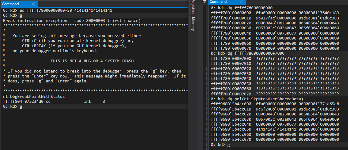 Remember the fixed mapping of VTL0's KUSER_SHARED_DATA in ring0VTL1 (0xfffff78000007000) we used as exploitation primitive? @aall86 randomized it (together with more stuff that used to be fixed :P). Thanks man!pic.twitter.com/b9aDMjlEmA