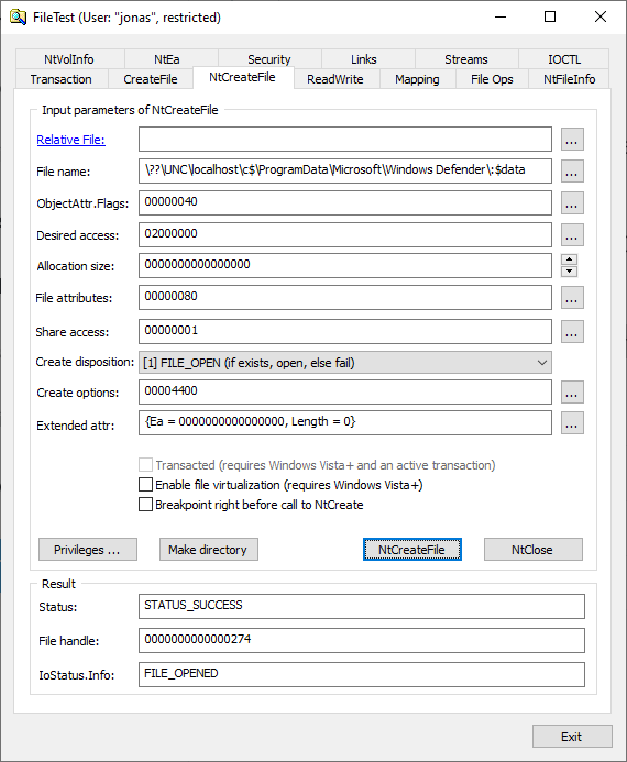 Also generic bypass of file "freeze" by minifilters: When you open UNC path if it ends with :$data - that is ignored when doing the open. This can create a mismatch between what is opened and what the filter sees.