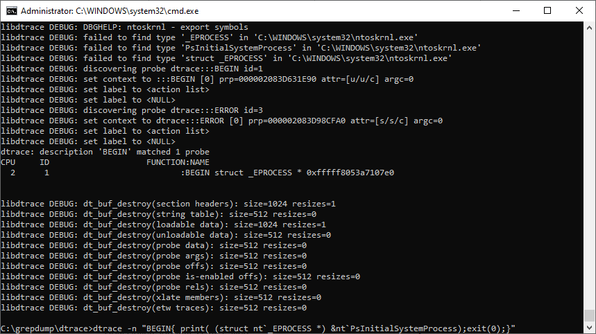 I can get dtrace working this much.... but syscall ,fbt,etw and pid probes I cannot figure out what requires to get working. Have anybody had success on latest windows 10 ? If you dont know dtrace- see https://github.com/microsoft/DTrace-on-Windows/blob/master/samples/windows/file/filedeletetracker.d …pic.twitter.com/F7RkCFyhmH