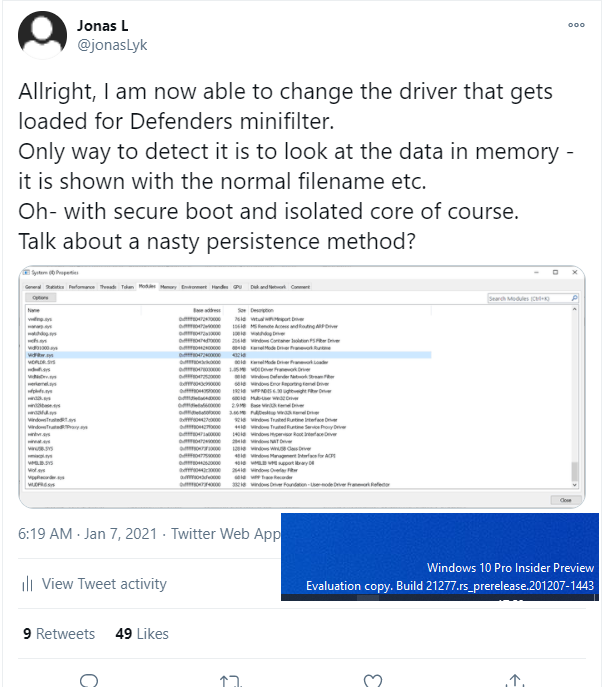 maybe start with learning antitamper in win 10 to not load the driver i want instead of defenders minifilter?pic.twitter.com/ZEl4RHFmQT