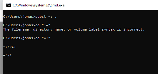But jonas- they are seperated by =, isnt that a valid drive letter also? What if you use it? Then you get trapped and cannot leave the drive- muhahahahahhapic.twitter.com/uaw36xpHpw