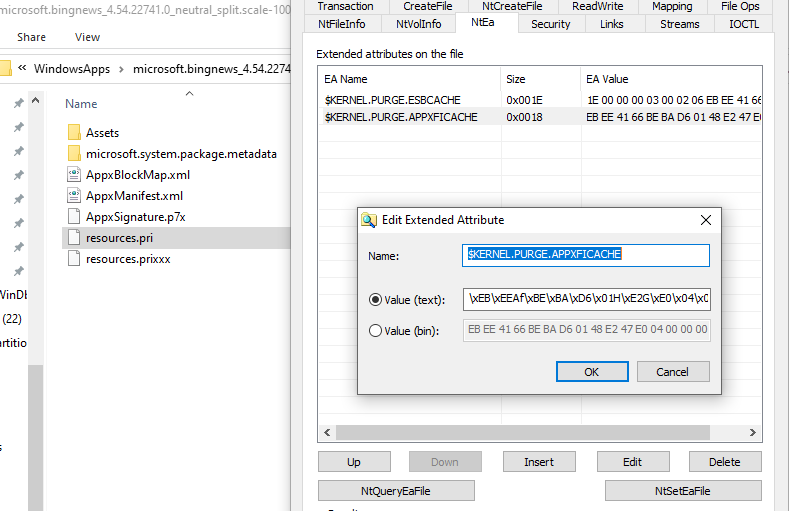 Fles in windowsapps have gotten a new nasty tamper protection. They get the following extended attribute applied. Its very effective protection, no amount of privs, file open flags or account can give you write access. Not even kernel mode open....damnpic.twitter.com/VKW7faYOoz