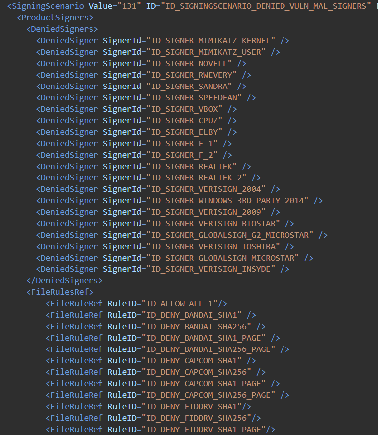 https://docs.microsoft.com/en-us/windows/security/threat-protection/windows-defender-application-control/microsoft-recommended-driver-block-rules … If you are curious which drivers Windows blocks by default with HVCI and KMCI kernel mode kernel signing the list is available here. We are constantly updating and you can of course use supplemental policies to add whatever you want.