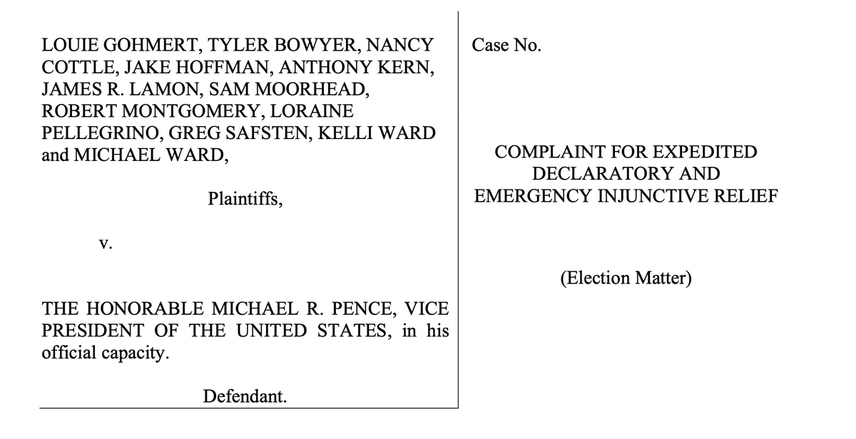 NEW: VP Pence has been sued by Rep. Louie Gohmert (R-Tex.), Kelli Ward and other GOP mbrs in a far-fetched bid to overturn Biden's win