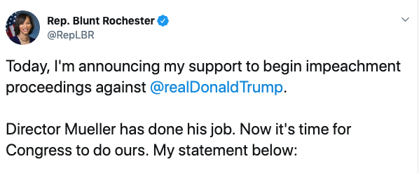 We're up to 91 House Democrats calling for the start of an impeachment inquiry with @RepLBR (Lisa Blunt Rochester of Delaware.)pic.twitter.com/Nhn2xzdoGM