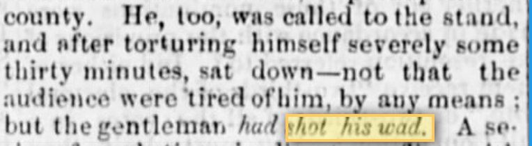 An antedating, regrettably, for "shoot one's wad', from Clearfield Republican (PA), 15 Aug. 1860pic.twitter.com/fADDFzdg3W