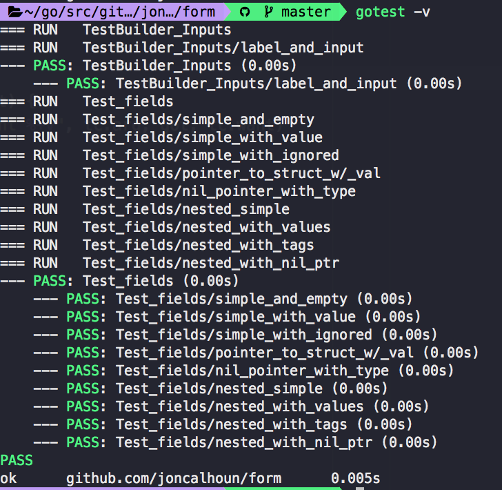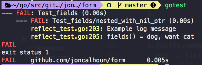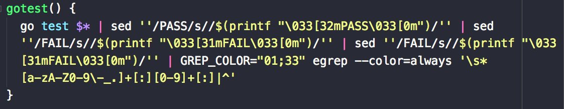 gotest() { go test $* | sed ''/PASS/s//$(printf "\033[32mPASS\033[0m")/'' | sed ''/FAIL/s//$(printf "\033[31mFAIL\033[0m")/'' | sed ''/FAIL/s//$(printf "\033[31mFAIL\033[0m")/'' | GREP_COLOR="01;33" egrep --color=always '\s*[a-zA-Z0-9\-_.]+[:][0-9]+[:]|^' } It fits in a tweet!