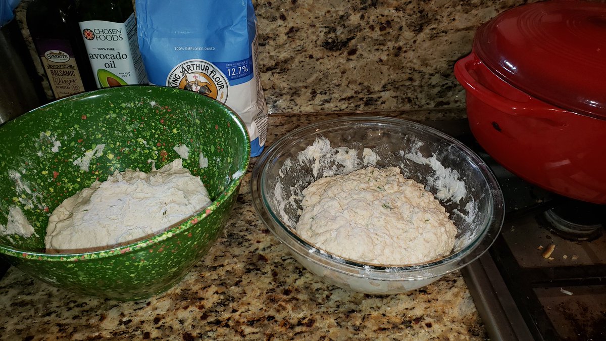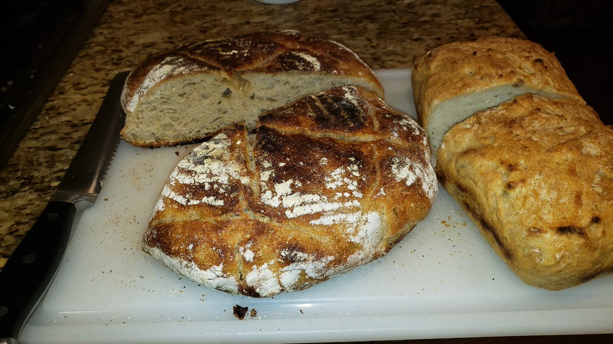 This weekend's bread haul: one sourdough round, one gluten free loaf. Had to cheat with a bit of baking soda on the gluten free loaf but a solid start.pic.twitter.com/dAZsWpPWr1