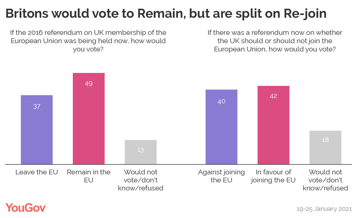 If the 2016 EU referendum were to happen again today, Britons would vote to Remain... but they are split on 'Re-join' If 2016 EU referendum held again: Remain - 49% Leave - 37% If referendum on re-joining EU: Re-join EU - 42% Not re-join EU - 40% https://www.thetimes.co.uk/article/not-all-remainers-would-be-ready-to-rejoin-eu-hpbn0qst0 …pic.twitter.com/JxumOUP0Tz