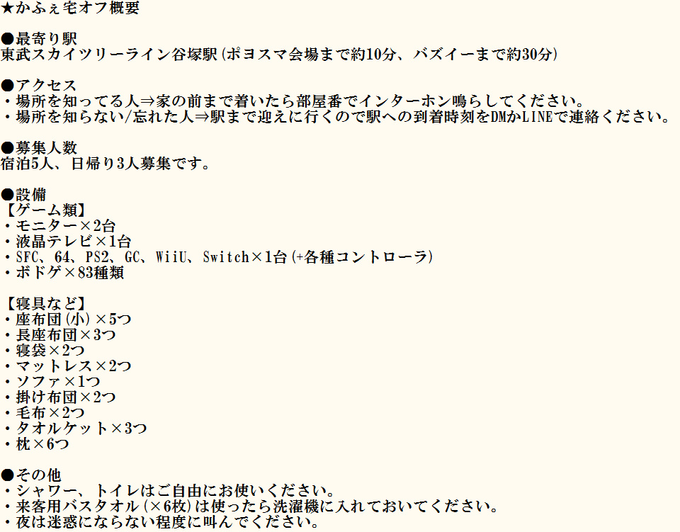 【週末かふぇ宅オフ募集】 参加希望者は下記の通りリプを下さい。詳細は画像にて。 一旦抜けて戻るとかあったら書いて下さい ■開催日時 2/7(金)20:00 ~ 2/8(土)10:00⇒ゆるスマ 2/8(土)20:00 ~ 2/9(日)11:00⇒ポヨスマ 【テンプレ】 金: 土: 日: (例1)金夜~日朝 金:22時着 土: 日:10時帰pic.twitter.com/Gk9EI97mLq