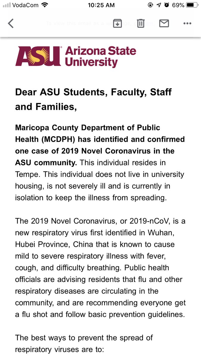 ICYMI: @ ASU students and surrounding community, the university sent out more info on the confirmed Coronavirus case and ways to avoid the spread of respiratory diseasespic.twitter.com/IICMUiwQIB