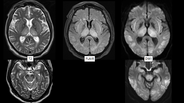 Dick's Pick of the Week: Uremic Encephalopathy T2 hyperintensity +/- rest diffusion within internal and external capsules (lentiform fork sign), basal ganglia, thalami, midbrain, and mesial temporal and parieto-occipital cortices.