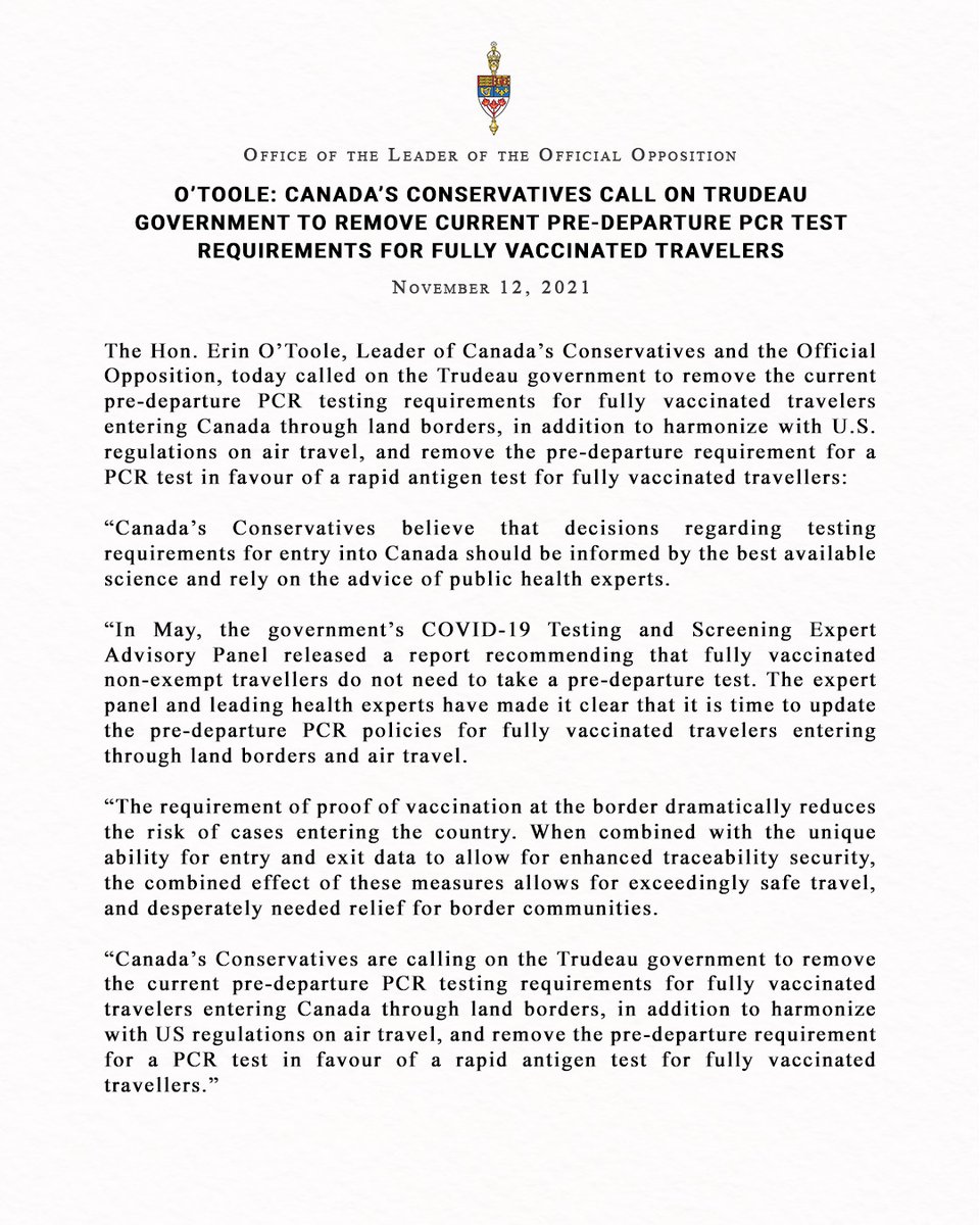 Canada’s Conservatives call on Trudeau government to remove current pre-departure PCR test requirements for fully vaccinated travelers
