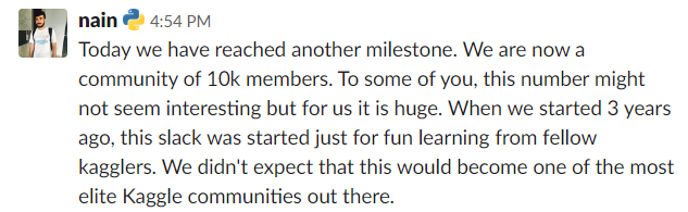 Congrats to one of the most active, encouraging Kaggle communities around! Keep it up! Psst — want to join? It's a great space for more than just