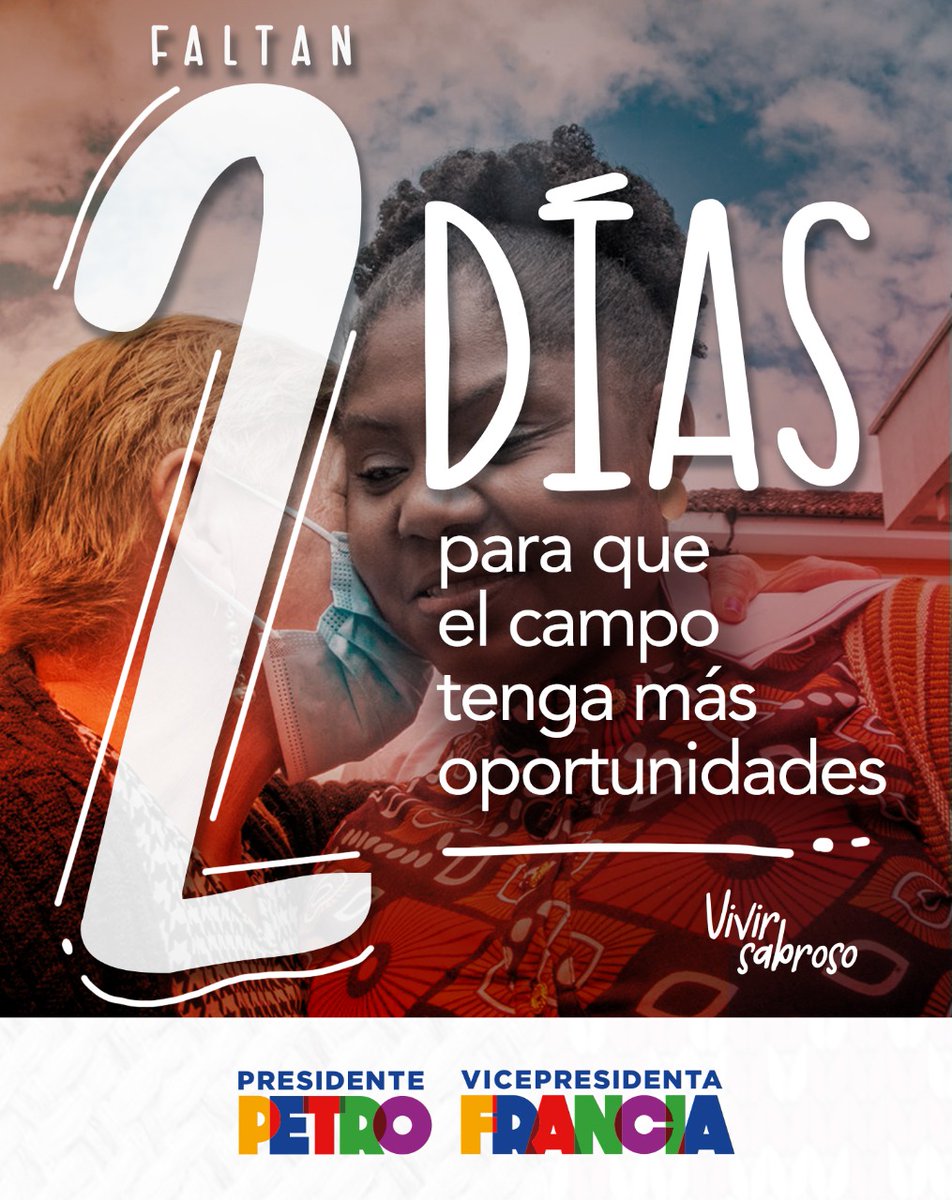 Estamos a 2 días para convertir abandono en oportunidades reales para el campo. Este 19 de junio votemos con contundencia y alegría para dignificar la existencia y labor del campesinado en Colombia. Vamos a #VivirSabroso