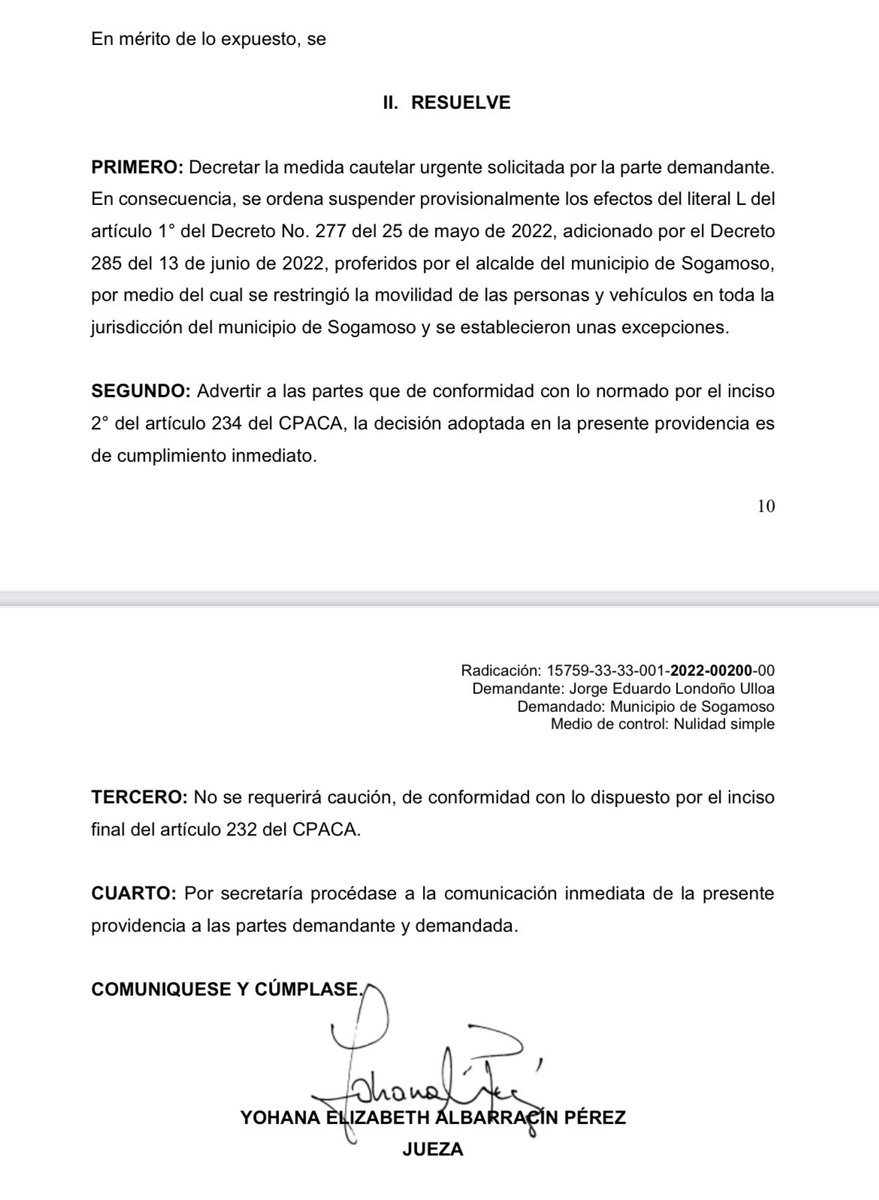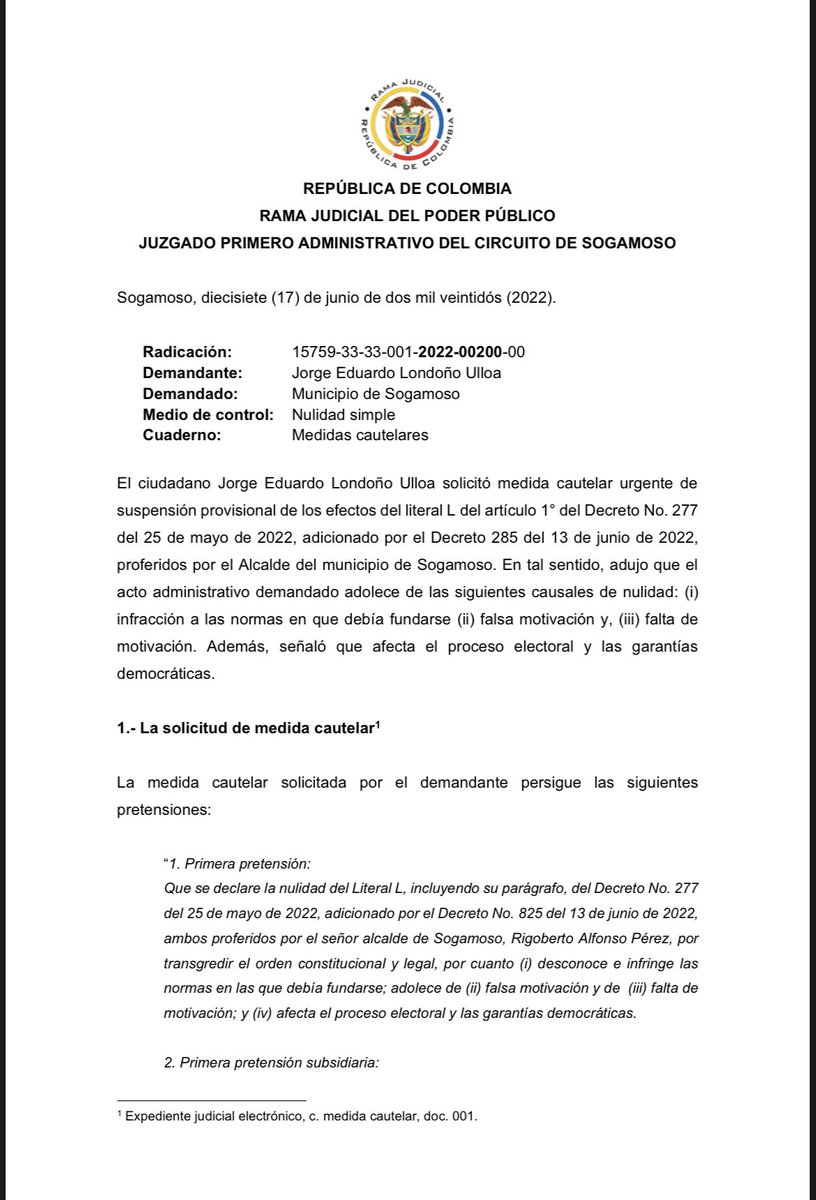 #Sogamoso accedió a la solicitud del senador@JorgeELondonoU y suspendió el toque de queda para el día de las elecciones. La Jueza encontró que el decreto del alcalde@RigoAlcaldeSog carece de motivación y vulnera la Constitución y la Ley.pic.twitter.com/66aaSdGHm3