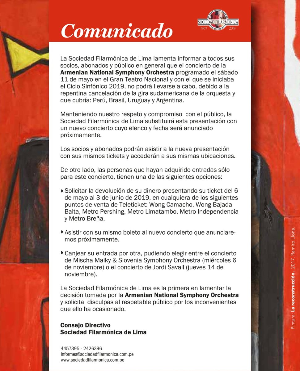 @SociFilarmonica informa a sus socios, abonados y público en general que el concierto de la Armenia National Symphony Orchestra programado el sábado 11 de mayo en el GTN ha sido cancelado debido a la repentina suspensión de la orquesta de su gira sudamericana:pic.twitter.com/VwMgWErPPl