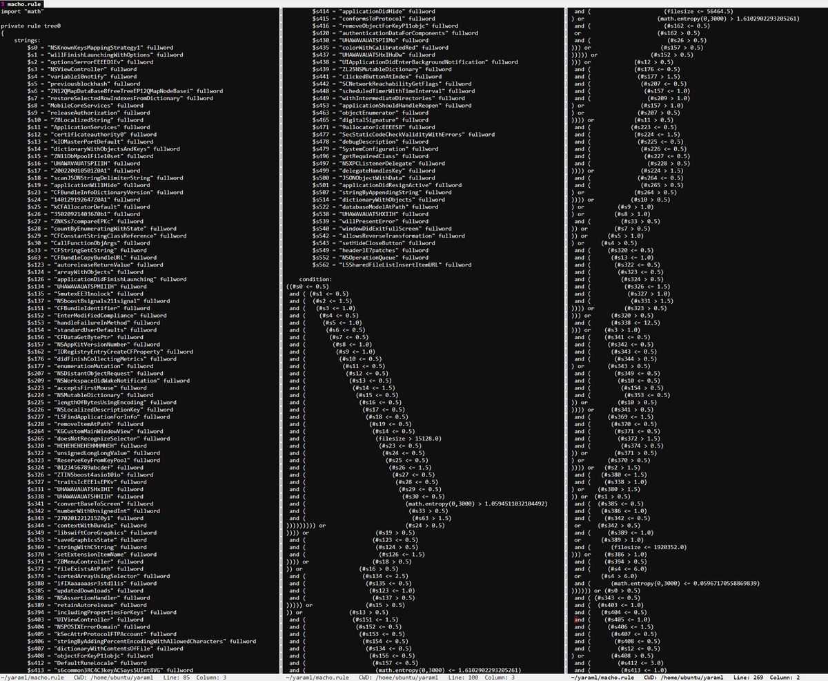 1\ Here's what a Yara-ified ML decision tree for OSX/Mach-O malware detection looks like. The full random forest is 3903 lines of Yara, computes @ 3ms per CPU per binary, and gets 67% detection @ 0.2% false positive rate. Will push to YaraML GitHub once results improve a bit.pic.twitter.com/hkgj90cJzY