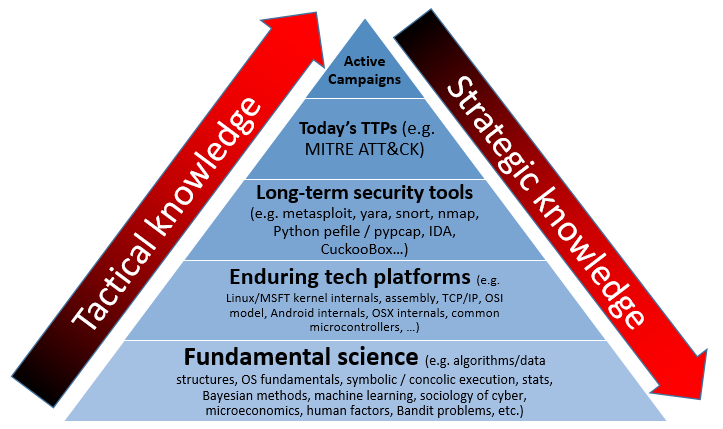 Some infosec knowledge is useful for months (knowledge of a given campaign), other knowledge, for years, (TTPs), other knowledge, for decades (the halting problem). Here's a "Pyramid of Pain" (cc/