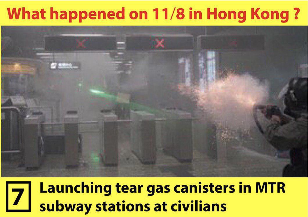 7. Launching tear gas canisters in railway stations at civilians https://twitter.com/joshuawongcf/status/1160561817740906497 …pic.twitter.com/LGKY8RyDKT