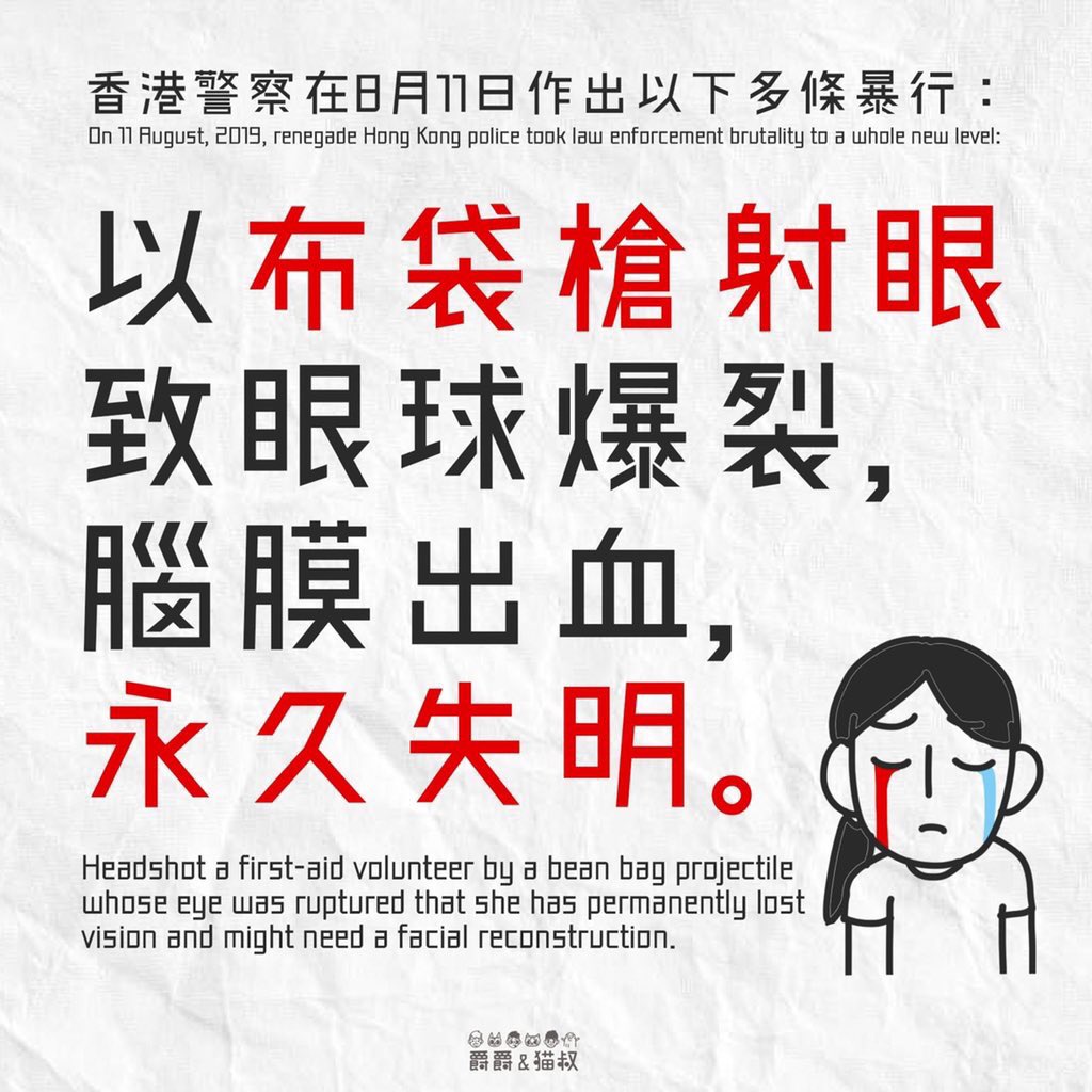 [Never forget - What happened on 11/8 in #HongKong?] #HKPoliceState 1. Riot Police Shooting bean bag bullets directly to a peaceful female protesters' eye, causing permanent blindness. https://twitter.com/joshuawongcf/status/1160527258953457665 …pic.twitter.com/5OuQhAmFU4