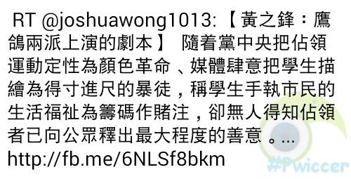 .http://fb.me/6NLSf8bkm RT @joshuawong1013: 【黃之鋒:鷹鴿兩派上演的劇本】 隨着黨中央把佔領運動定性為顏色革命、媒體肆意把學生描繪為得寸進尺的暴徒,稱學生...