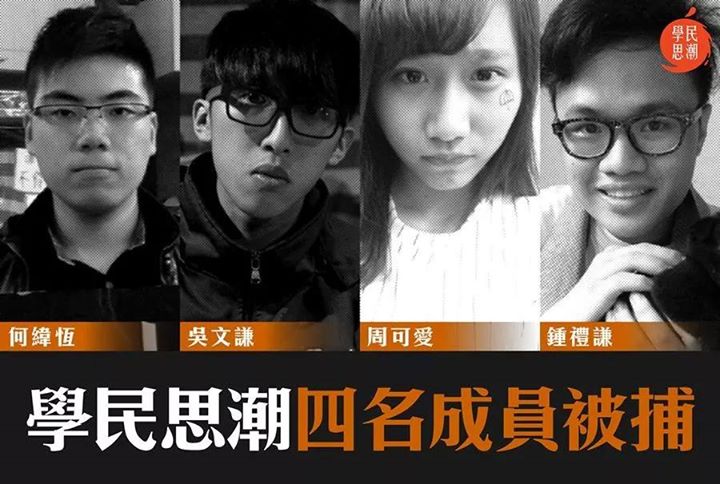 学民は何緯恆、吳文謙、周可愛、鍾禮謙の4名が逮捕された。 ジョシュア:ありがとう、みんな。 via @joshuawong1013 謝謝你們 何緯恆、吳文謙、周可愛、鍾禮謙 http://fb.me/2B4ce1Hom pic.twitter.com/Ouk98P6OWm