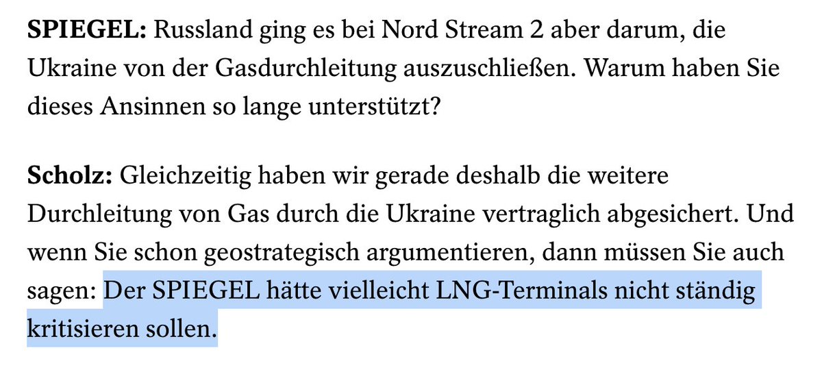 @derspiegel, der Nord Stream 2 seit Langem immer wieder kritisiert hat, nun schuld daran sein soll, dass Deutschland keine LNG-Terminals hat – und nicht z.B. die SPD, deren Politiker Kritik an NS2 als amerikanischen LNG-Lobbyismus abtaten.pic.twitter.com/MboBWieqoh