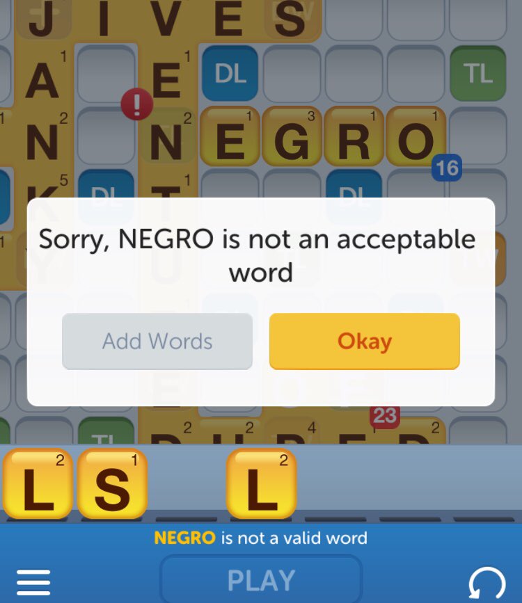 Words With Friends’ excessive wokeness is making it hard for me to get tiles on the board.pic.twitter.com/SqBiRQNEYu