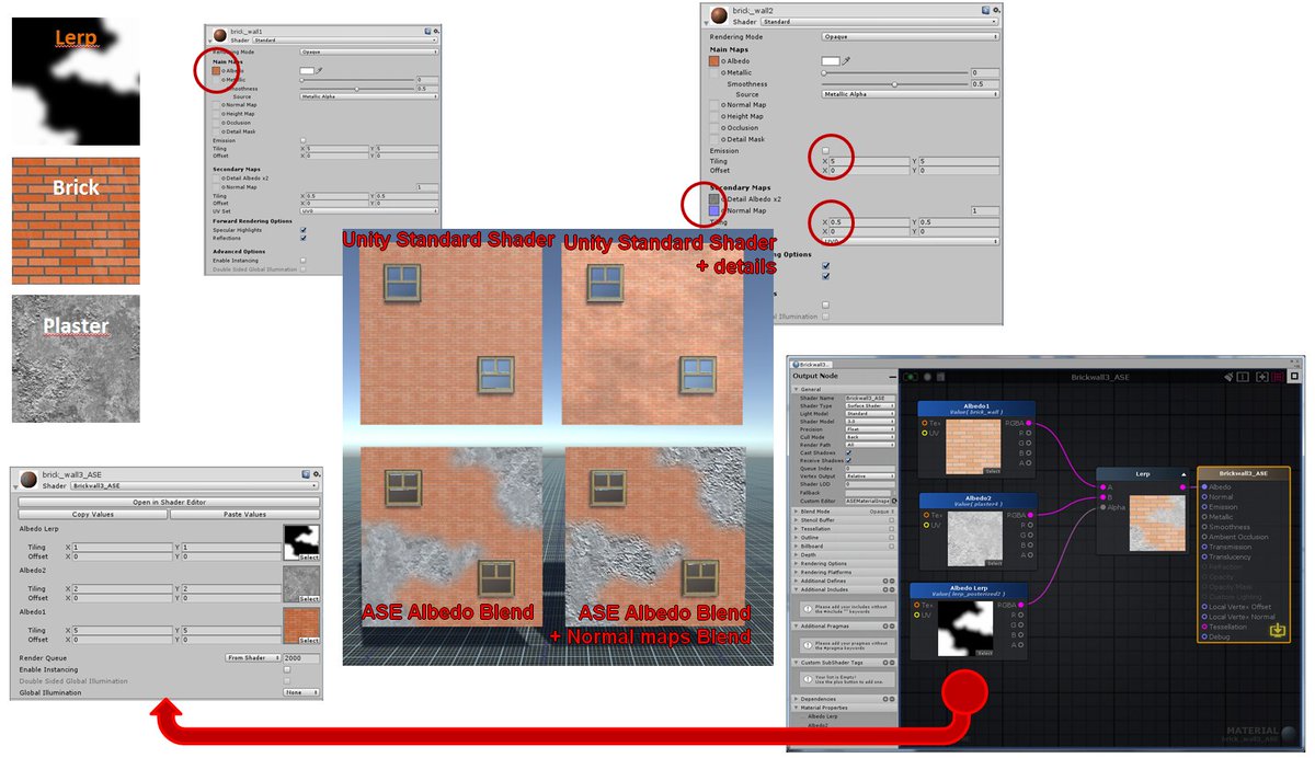 As a start, here's a quick comparison between the various "simple ways" to do it. I'm comparing the Standard shader, the Standard + using the details slots, a lerp between two albedo with ASE (graph provided), and the same last one but with a lerp between the normal maps.pic.twitter.com/gmqvsG4naZ