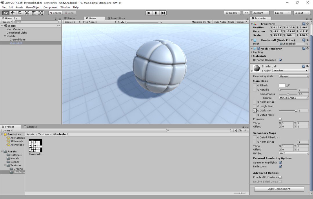 I just put on GitHub the 3D model of the shaderball I made with Blender, with an accompanying Unity project : https://github.com/Pseudopode/UnityShaderBall … The model is available in different formats (3ds, obj, dae, fbx), the AO map is also there. The model is CC0, the Unity project is MIT