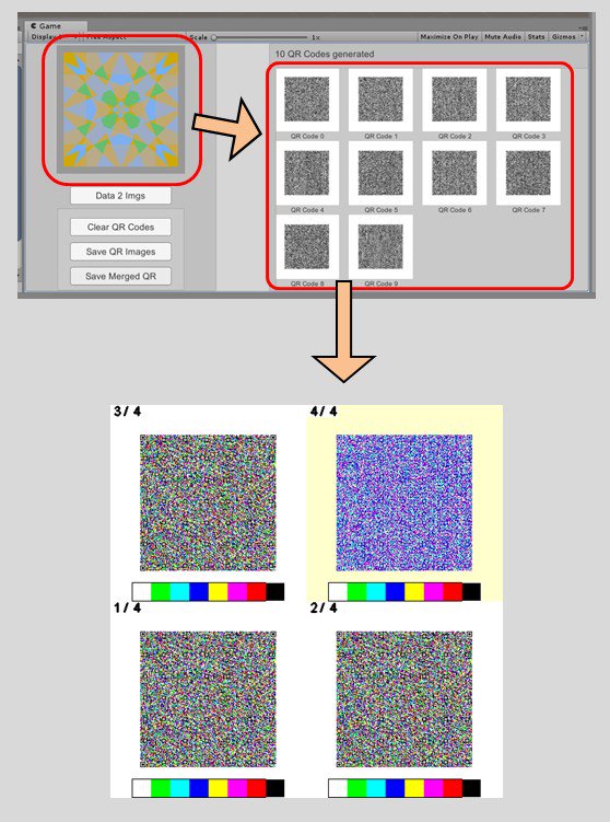 A quick WIP : Unity project to store binary data (here a pic) in successives BW QR codes. The resulting codes are merged to create RGB QR. All of the codes are grid packed, and various data (palette, human readable infos) are added... Meant to be decodables the other way around.pic.twitter.com/LQhrgAwWIY