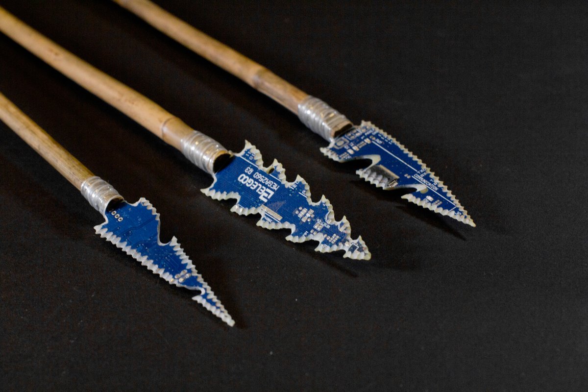 Arduino Spears (handcrafted from whittled bamboo, abandoned plastic bottles and the detritus of electronic circuit boards, for Mitigation of Shock
