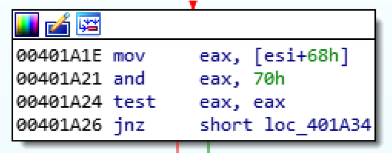 Another anti-analysis technique is to check offset 0x68 in the PEB. This field is known as NtGlobalFlag and will have a value of 0x70 if being debugged. With