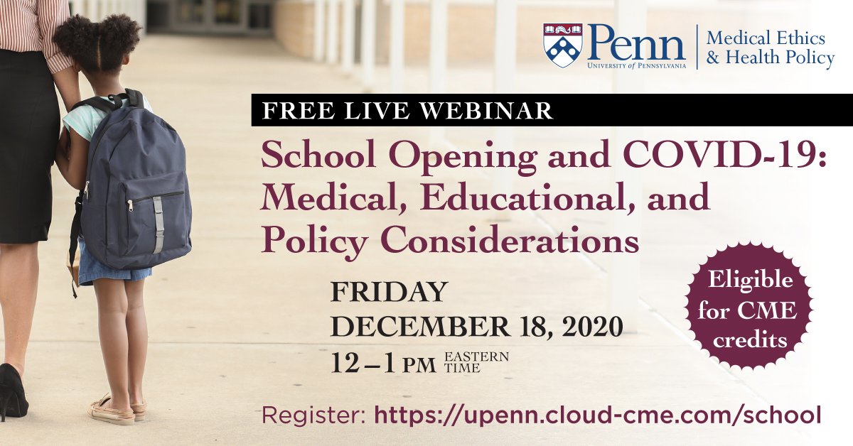 Free Webinar Fri., Dec. 18 Noon EST | School Opening and COVID-19: Medical, Educational and Policy Considerations — featuring