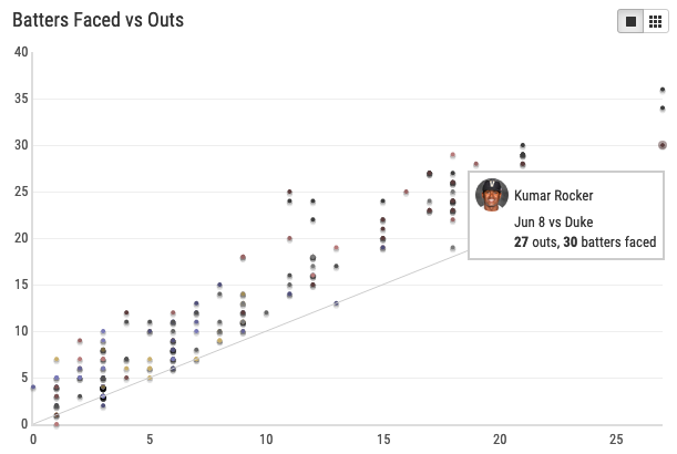2. Two pitching performances stand out on the scatter plot. Eder's 13 batters faced, 13 outs against UT. And of course, Kumar's no hitter. Also, Chance Huff had the rare 0.1 IP facing 0 batters on a runner thrown out on a wild pitch.pic.twitter.com/oczCFKTioY