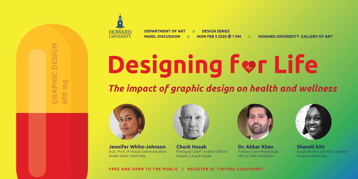 #GraphicDesign on#HealthandWellness At 1pm@HowardU With Jen White-Johnson@jtknoxroxs, Chuck Husak@AugustLangHusak, Dr. Akbar Khan@FollowMercy and Shanell Kitt@HowardU FREE. Join us!pic.twitter.com/XhSsmik1qY – mjesto: Howard University Art Gallery