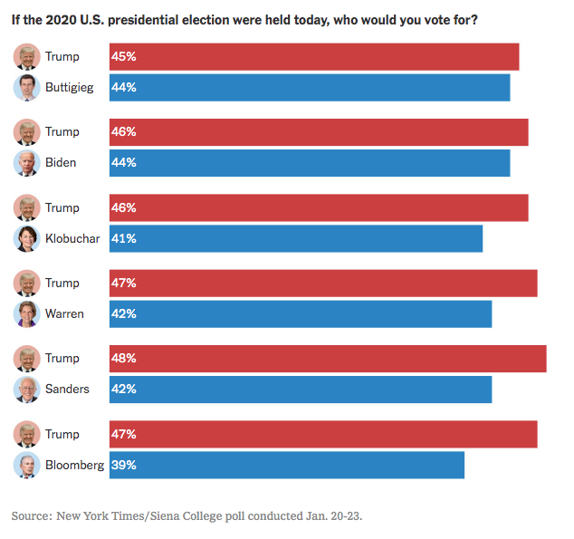 As Biden sort of stumbles in various primary polls, would be interesting to see if he’s still doing better head-to-head against Trump than any of the other Democratic candidates. My assumption is his numbers will be down there too, but I don’t really know.