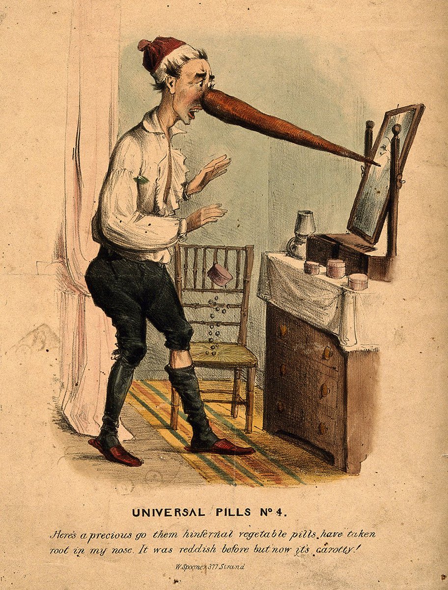 A horrified man discovering that as a result of taking vegetable pills, his nose has turned into a carrot.