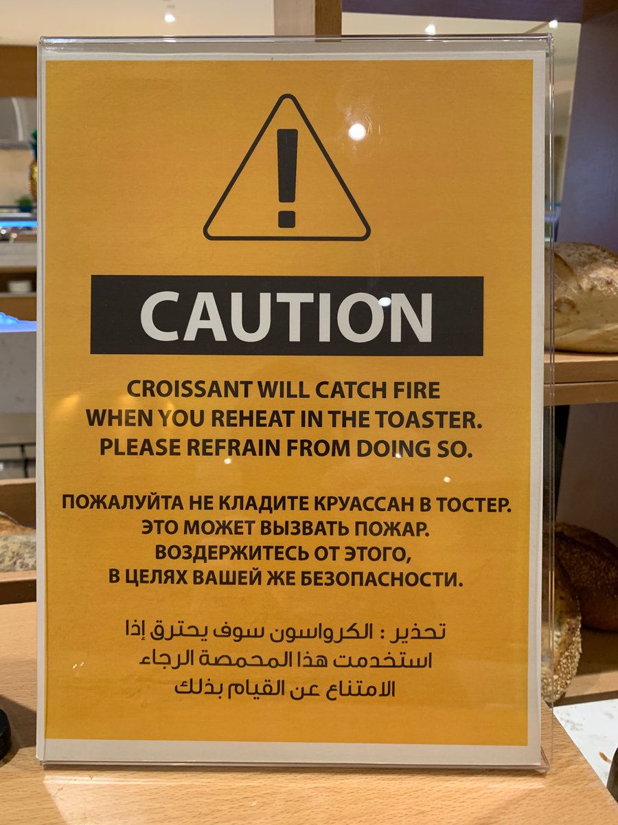 Some people say that just providing info is not enough to change behavior. They never clearly never met the terrifying “croissant will catch fire” sign at a hotel breakfast...@CassSunstein @R_Thaler @dilipsoman @GrosvenorHousepic.twitter.com/ydMRwmXnxM