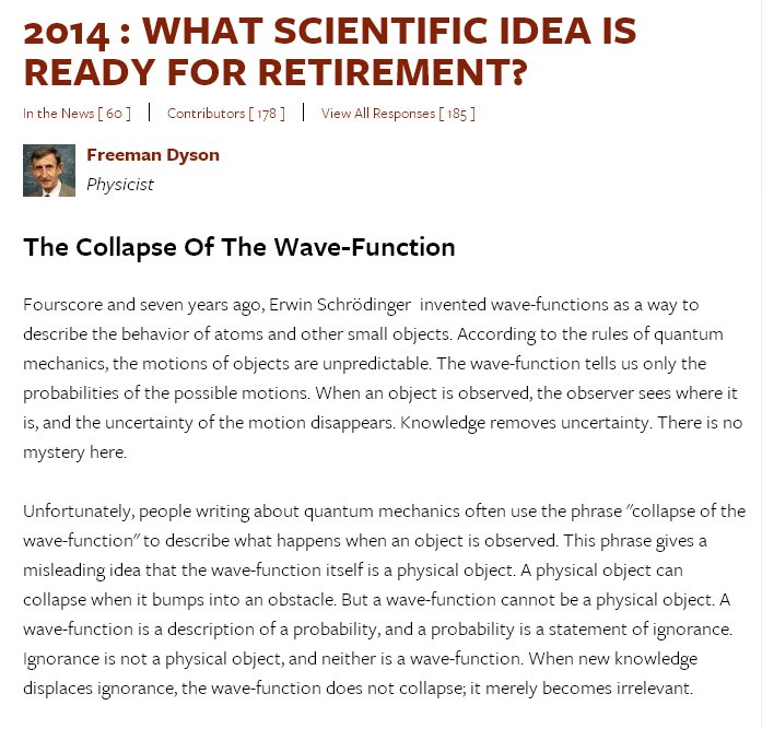 My new favorite: Freeman Dyson. He gives easy to understand explanation of how everyone has mixed-up what a wave function is. Yay! But, I was arguing with actual physicists about it and the dmmmies still don't get it. Boo! Some people think an electron is a wave function. (1/2)pic.twitter.com/Yduhbvwx1W