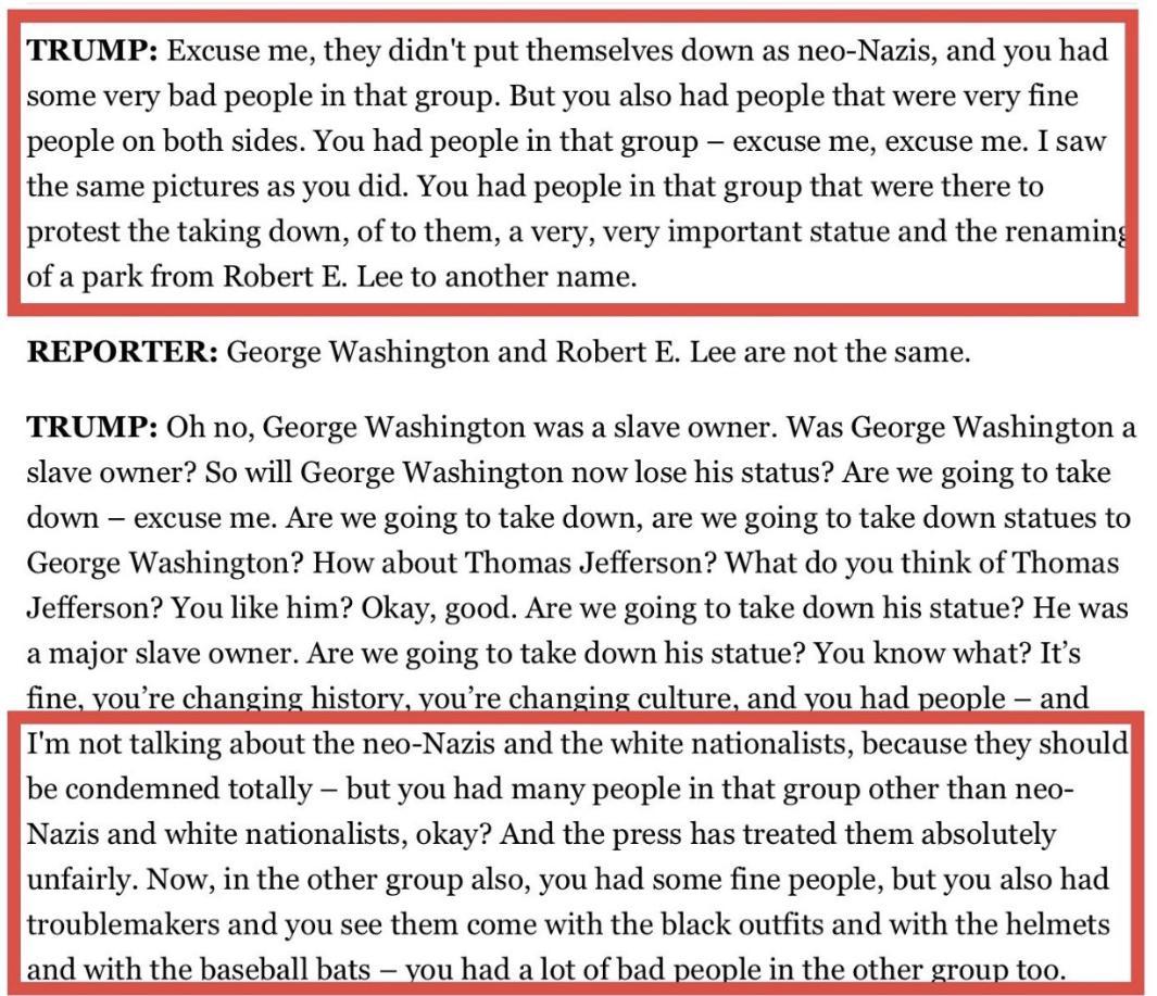 You wrote: The worst moment occurred when Trump refused to come down hard and decisively against the neo-Nazis who marched in Charlottesville, Virginia, in August 2017 chanting, “The Jews will not replace us!” Even @jaketapper showed the entire quote on his show. #FinePeopleHoaxpic.twitter.com/Uz6qCul9Vs